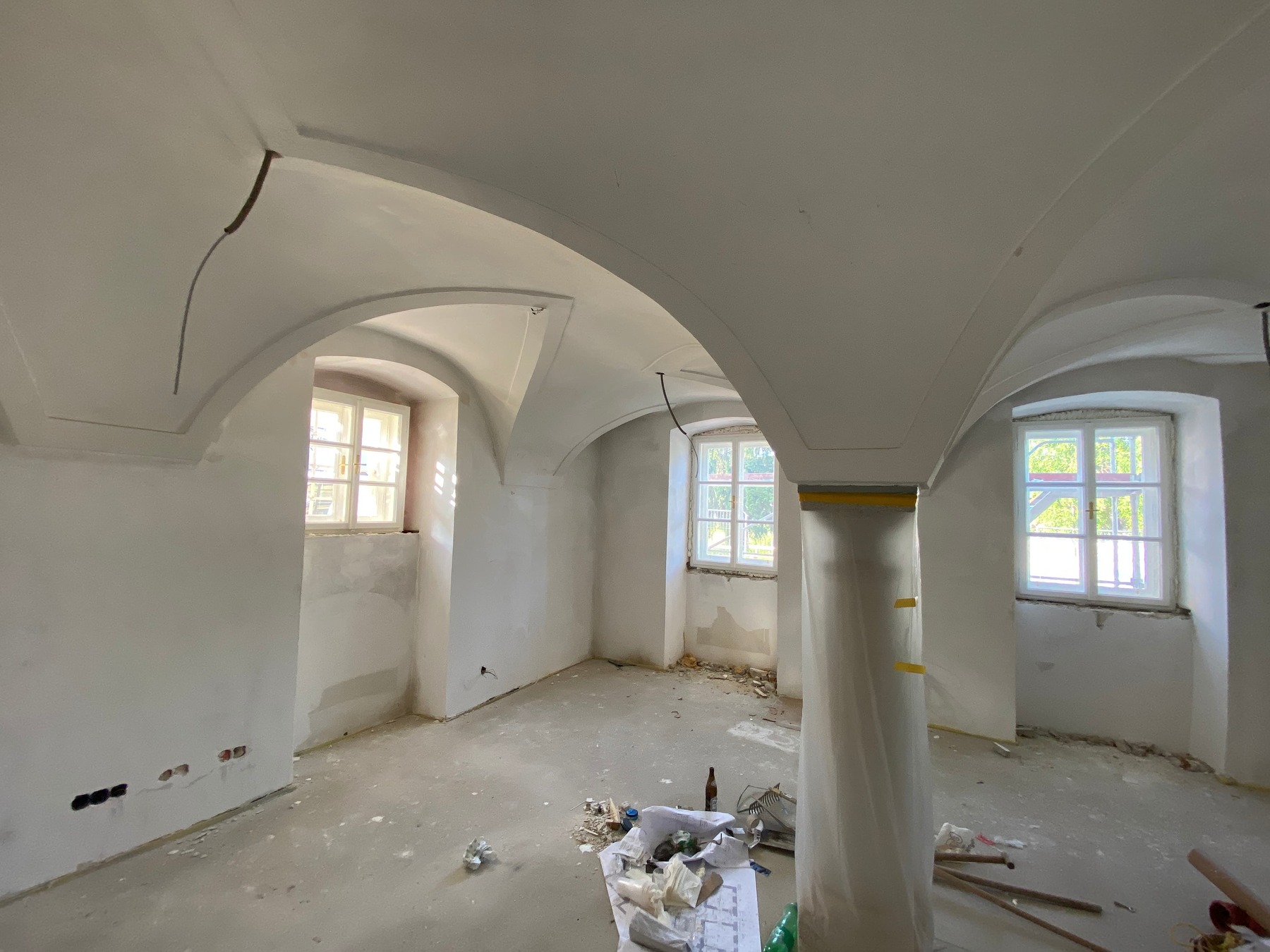 Die Gesamtarbeiten liegen voll im Zeitplan. Als nächster großer Schritt wird der Dachstuhl saniert und die Dacheindeckung erneuert.