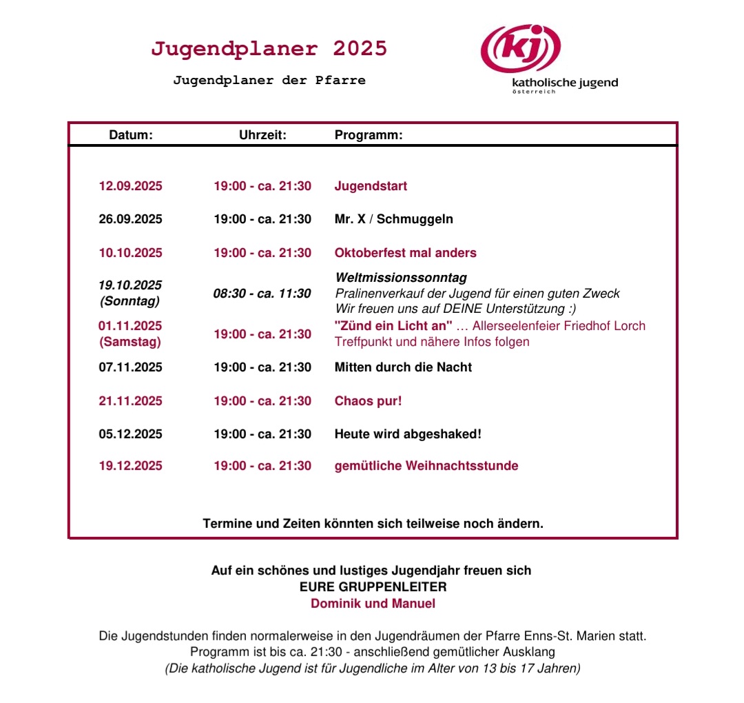 Die Termine dazu findest du aktuell auf der Homepage der Pfarre. Wir freuen uns darauf, dich kennenzulernen!