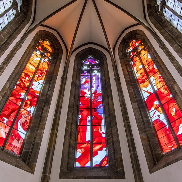 Die mittleren drei von den fünf Fenstern im Hochchor der Kirche Enns-St. Marien wurden vom Tiroler Maler und Grafiker Markus Prachensky (1932-2011) entworfen und in den Werkstätten der Firma Geyerling in Wien hergestellt.