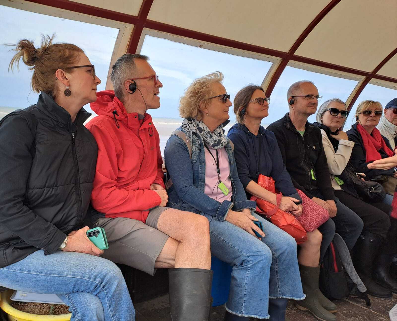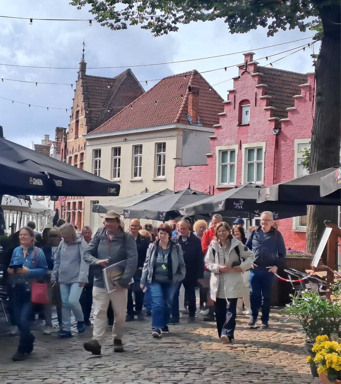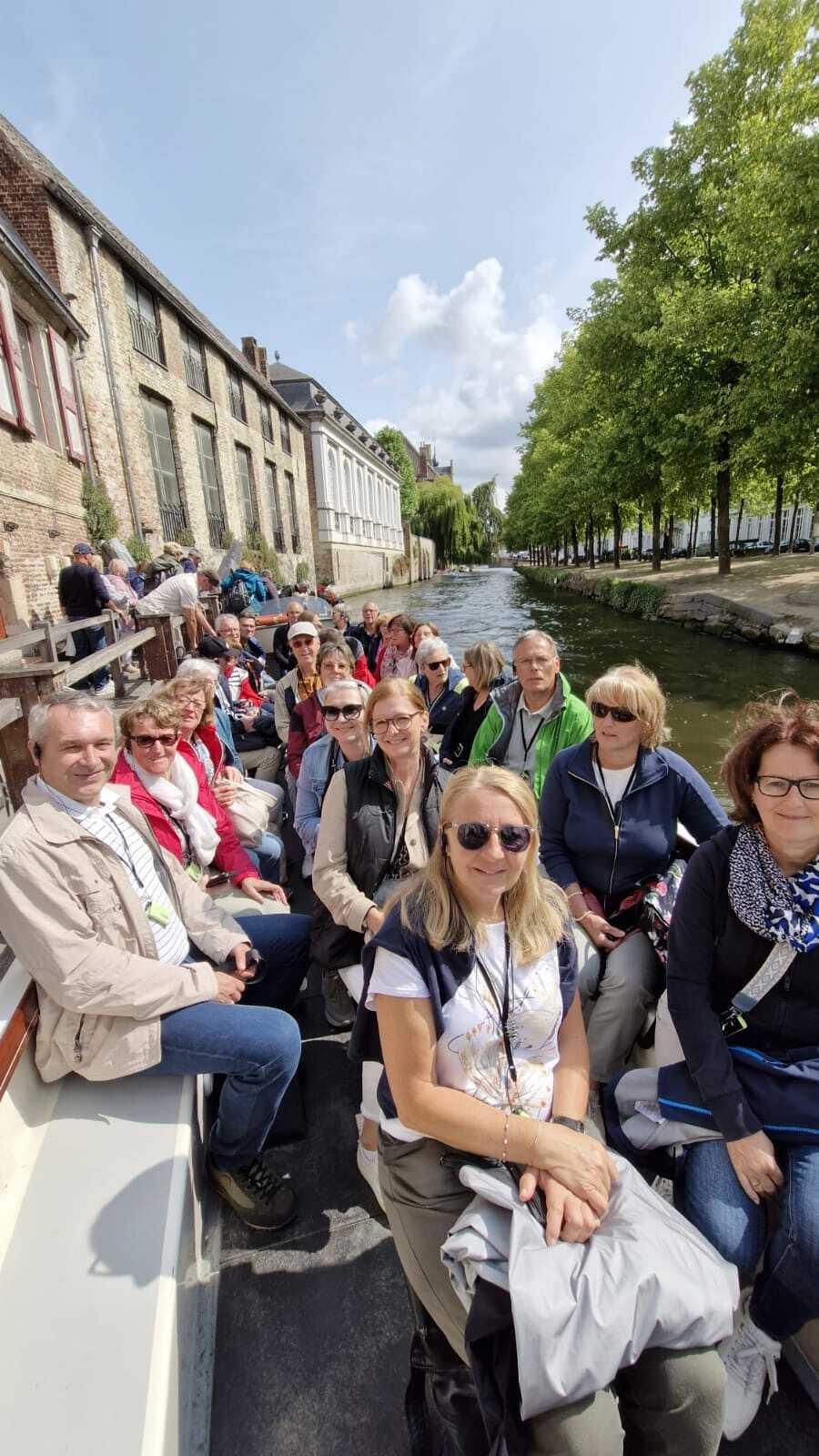 Die nächsten beiden Tage führten uns in die Städte Antwerpen und Gent, wo es jeweils nach ausgiebigen Stadtrundgängen die Möglichkeit für 1a-Kunstgenuss gab: In Antwerpen konnten wir in der Liebfrauenkathedrale die weltberühmten Gemälde von Peter Paul Rubens besichtigen und in Gent in der Kathedrale den Genter Altar von Jan van Eyck. Ein nächster Höhepunkt war die Fahrt mit dem Pferdeplanwagen an der belgischen Nordseeküste, von dem aus wir Pferde beim Krabbenfischen am Strand beobachten konnten und viel Wissenswertes über dieses immaterielle Kulturerbe erfuhren. Am vierten Tag besuchten wir die bezaubernde Stadt Brügge, wo die Grachtenfahrt mit dem Boot auf den Wasserkanälen ein besonderes Highlight war. Den Abschluss unserer Reise bildete die Besichtigung von Brüssel. Dort feierten wir in der Kathedrale von St. Michael gemeinsam mit unserer Seelsorgeverantwortlichen Irmi einen schön gestalteten Wortgottesdienst zum Thema „Unterwegs-Sein“. Danach besuchten wir als krönenden Abschluss noch das Atomium, das anlässlich der Weltausstellung 1958 errichtet wurde.