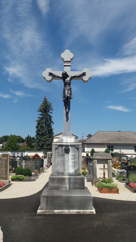 Im Zentrum des neuen Friedhofs wurde 1898 auf einem massiven Sockel ein großes steinernes Kreuz mit einem wunderschönen Christus errichtet, der seither über den Friedhof wacht. Eine Gravur an der Rückseite des Sockels nennt die Stifter: "Gewidmet von den Fuschlschen Geschwistern in der Holzpoint MDCCCXCVIII." An der Vorderseite ist eingraviert: "Selig sind die Todten, die im Herrn sterben. Sie werden ausruhen von ihren Mühsalen und ihre guten Werke folgen ihnen nach. Offenb. XV.13" Im Jahr 2018 musste das Kreuz durch ein Neues in originaler Größe und Form ersetzt werden. Der Sockel konnte in seiner ursprünglichen Form erhalten bleiben. Die bemerkenswerte Christus Figur ist aus Metallguss angefertigt.