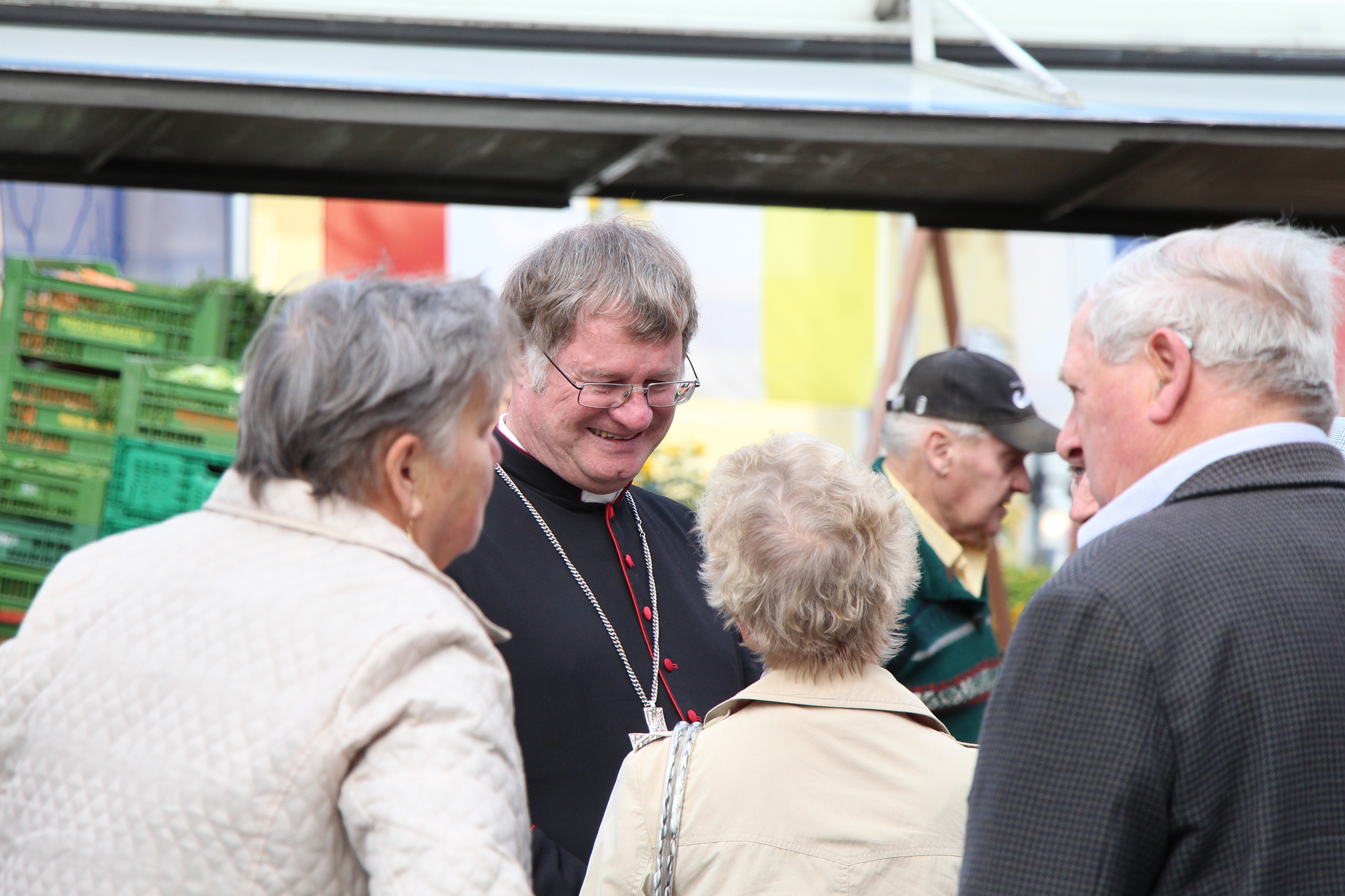 „Ja, der Herr Bischof! Jetzt muss ich Ihnen aber schon die Hand geben!“ Viele, die auf dem Wochenmarkt einkaufen, freuen sich, dass sie zwischen Speck und Bauernbrot „ihrem“ Bischof begegnen und ein paar persönliche Worte wechseln können. Manfred Scheuer schüttelt Hände, fragt die „Standler“, wie das Geschäft läuft, und hat ein offenes Ohr für alles, was ihm erzählt wird: von der Situation in der eigenen Pfarre bis hin zur persönlichen Lebenssituation. Aber auch der Bischof wird gefragt, wie es ihm jetzt geht in Oberösterreich. Viele sagen einfach nur: „Schön, dass Sie heute da sind!“ – und die Freude ist ihnen deutlich anzusehen.